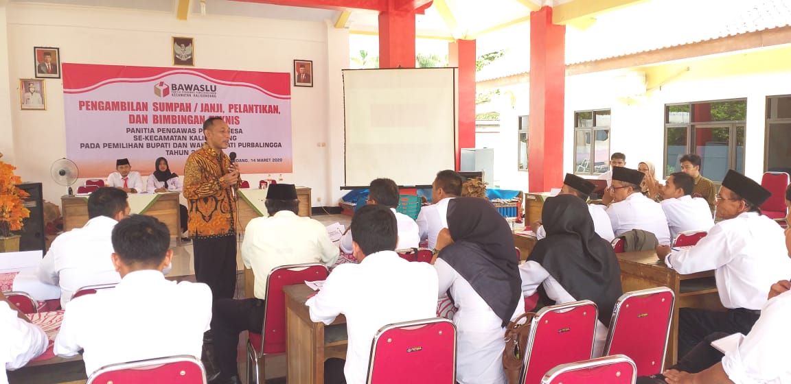 Ketua Bawaslu Kabupaten Purbalingga, Imam Nurhakim yang menghadiri pelantikan di Kecamatan Kalimanah memberikan arahan kepada Panwaslu Kelurahan/Desa yang baru dilantik terkait tugas, wewenang dan kewajibannya sebagai Panwaslu.