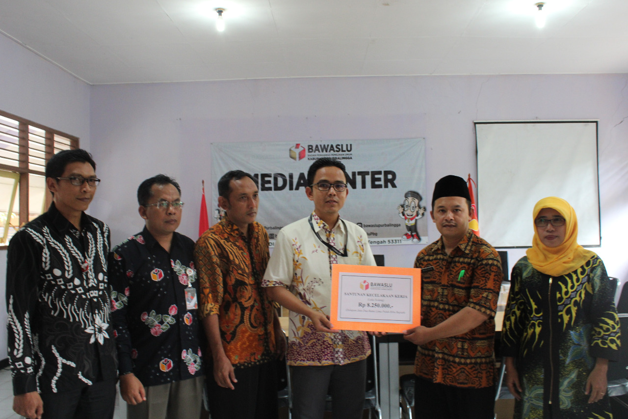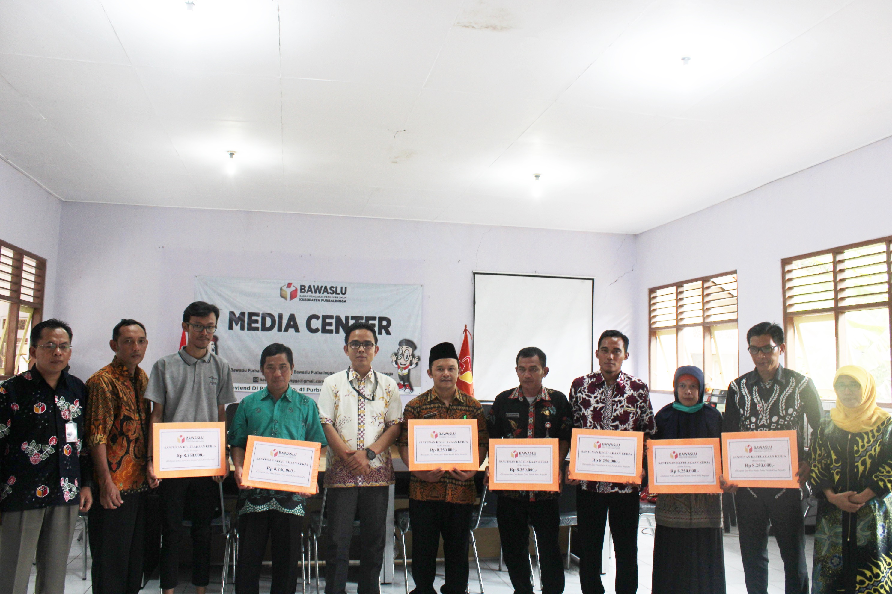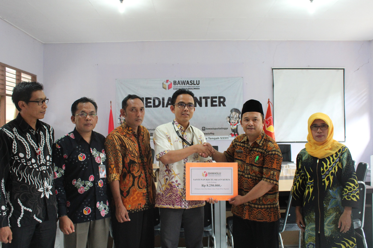 PURBALINGGA - Bawaslu Kabupaten Purbalingga hari ini 02/10 di Aula Bawaslu Purbalingga secara simbolis menyerahkan santunan kepada delapan orang jajaran Bawaslu Purbalingga yang mengalami kecelakaan kerja pada saat pemilu 2019 lalu.