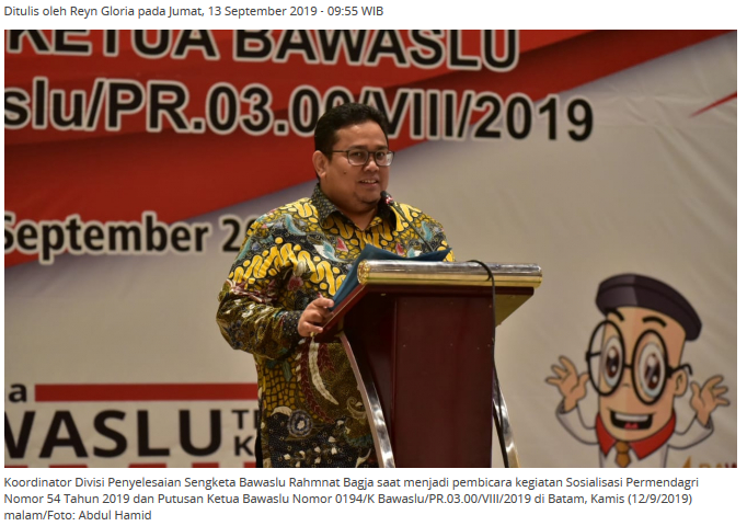 "Kami harap jangan sampai ada masalah, pencairannya juga harus dijadikan pelajaran hal seperti itu," katanya dalam kegiatan Sosialisasi Permendagri Nomor 54 Tahun 2019 dan Putusan Ketua Bawaslu Nomor 0194/K Bawaslu/PR.03.00/VIII/2019 di Batam, Kamis (12/9/2019) malam.