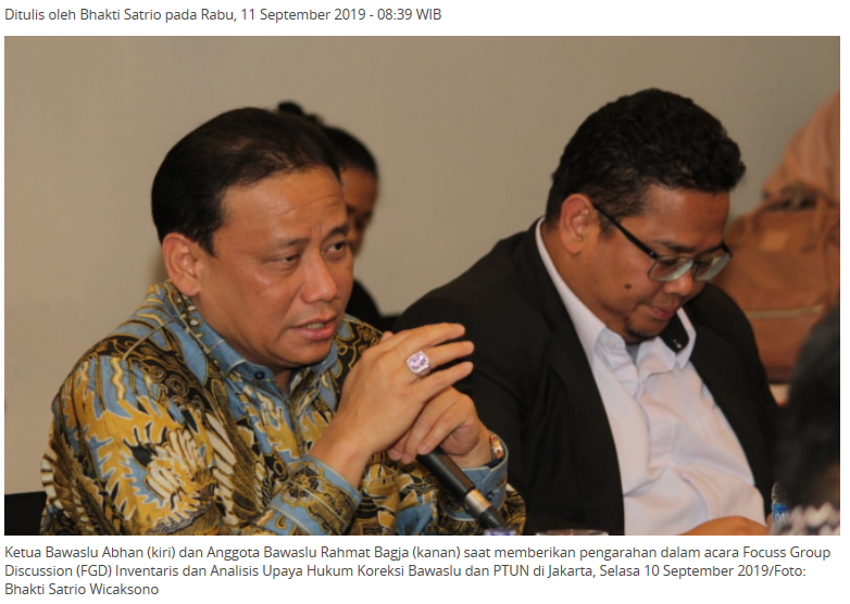Jakarta, Badan Pengawas Pemilihan Umum - Dalam menyambut Pilkada 2020, Ketua Bawaslu Abhan berharap, ada peningkatan kualitas dalam penanganan sengketa proses. Hal tersebut dia sampaikan dalam membuka acara Focuss Group Discussion (FGD) Inventaris dan Analisis Upaya Hukum Koreksi Bawaslu dan PTUN di Jakarta, Selasa, (10/09/2019).