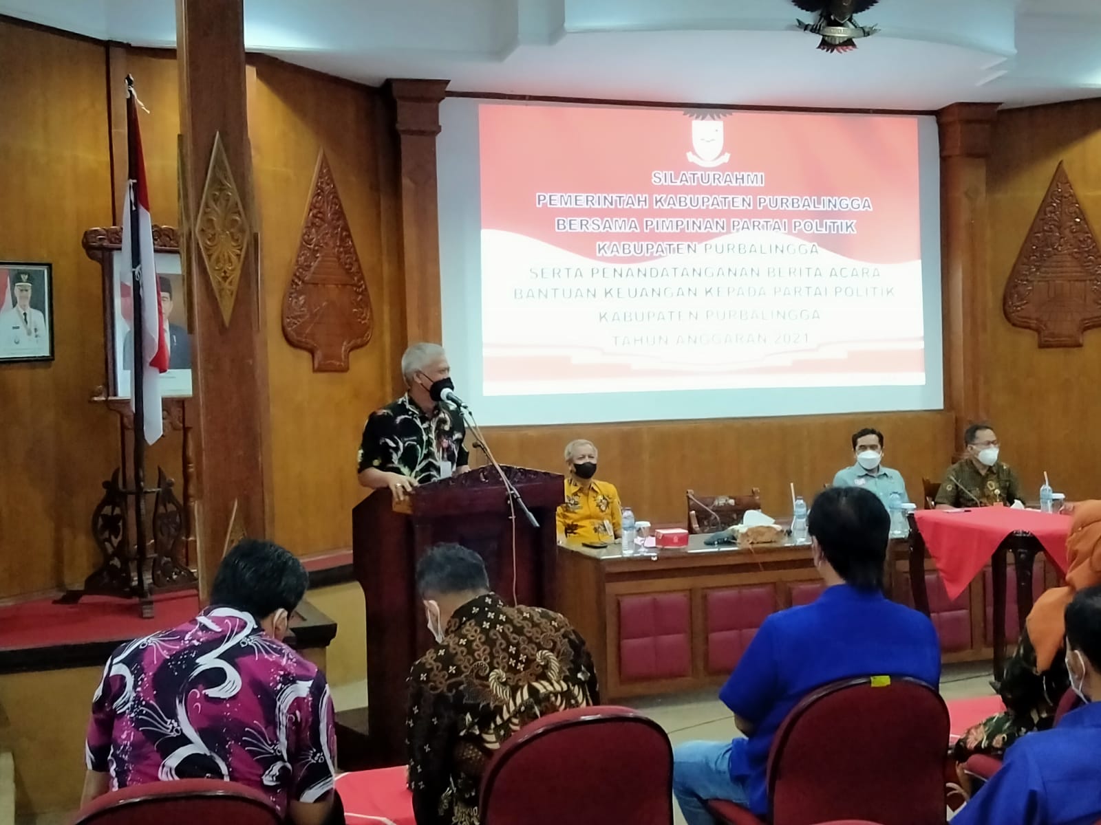 Purbalingga, tanggal 9 September 2021 bertempat di gedung Graha Adiguna Operation Room Kabupaten Purbalingga, Bawaslu Kabupaten Purbalingga menghadiri acara Silaturahmi Pemerintah Daerah Kabupaten Purbalingga dengan Pimpinan Partai Politik Kabupaten Purbalingga serta penandatanganan bersama Berita Acara Serah Terima Bantuan Keuangan kepada Partai Politik Tahun Anggaran 2021 sesuai dengan undangan Pemerintah Kabupaten Purbalingga tertanggal 2 September 2021 kepada Bawaslu. Acara dihadiri oleh Anggota Bawaslu Kabupaten Purbalingga yakni Misrad, SE.