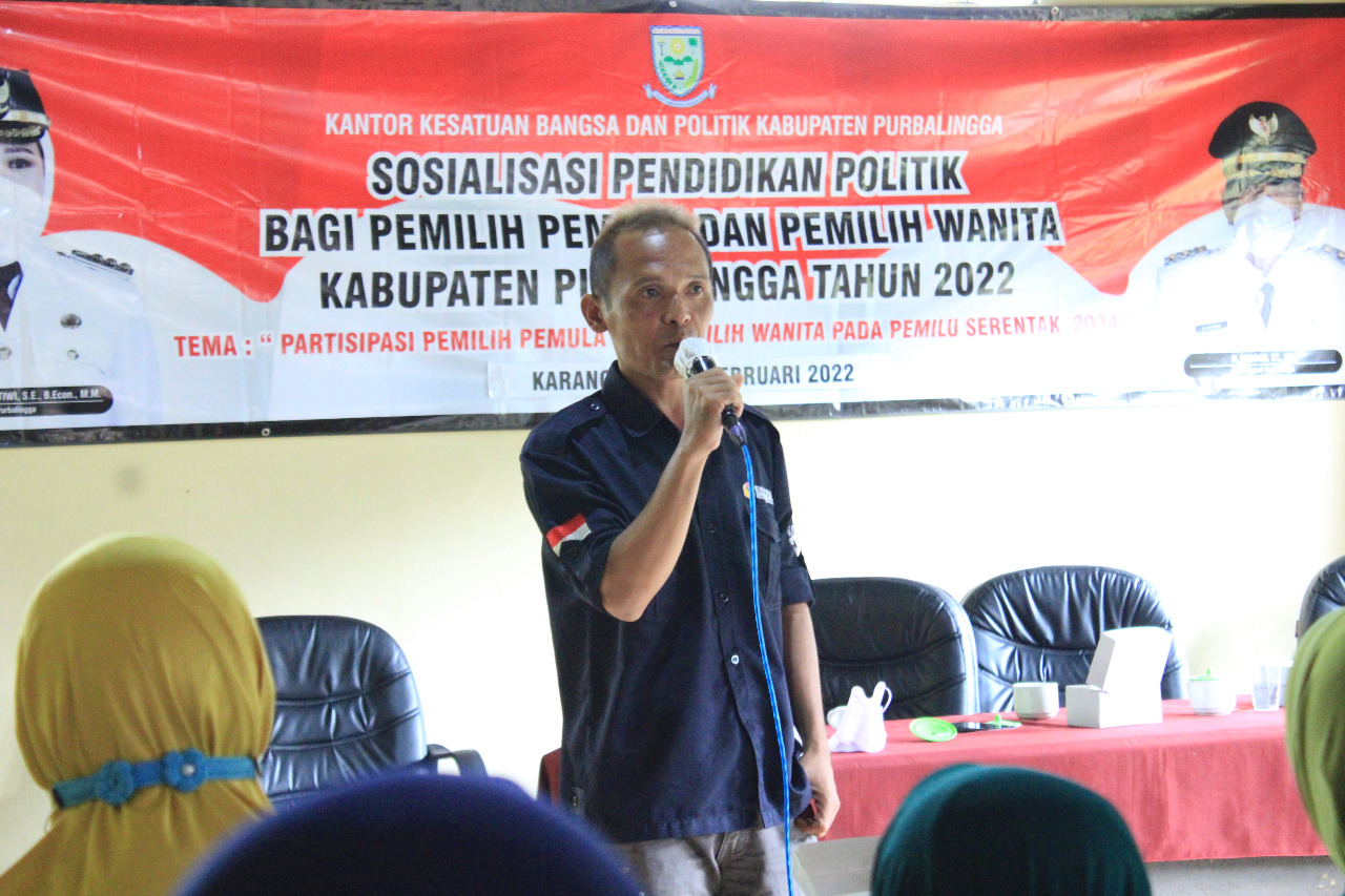 Purbalingga - Anggota Badan Pengawas Pemilu (Bawaslu) Kabupaten Purbalingga, Teguh Irawanto, pada senin (21/2/2022) hadir sebagai narasumber dalam kegiatan Sosialisasi Pendidikan Politik Bagi Pemilih Pemula dan Pemilih Perempuan Kabupaten Purbalingga tahun 2022 yang diselenggarakan oleh Kantor Kesatuan Bangsa dan Politik (Kesbangpol) Kabupaten Purbalingga, bertempat di Kecamatan Karangreja.