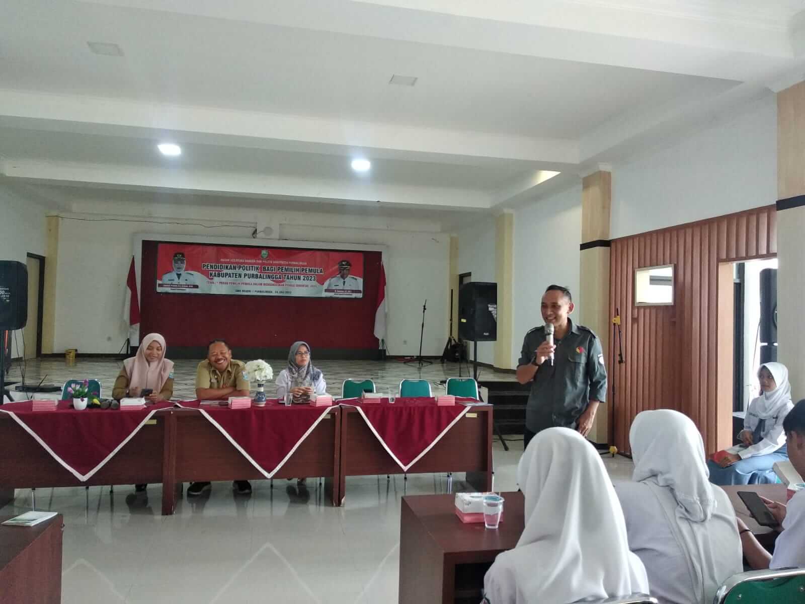 PURBALINGGA_Anggota Bawaslu Kabupaten Purbalingga sekaligus Koordinator Divisi Penanganan Pelanggaran dan Data Informasi Joko Prabowo mengajak Pemilih Pemula untuk menjadi pengawas partisipatif, dalam kegiatan Sosialiasasi Pendidikan Politik bagi Pemilih Pemula Kabupaten Purbalingga tahun 2022, Senin 24/7/2023.