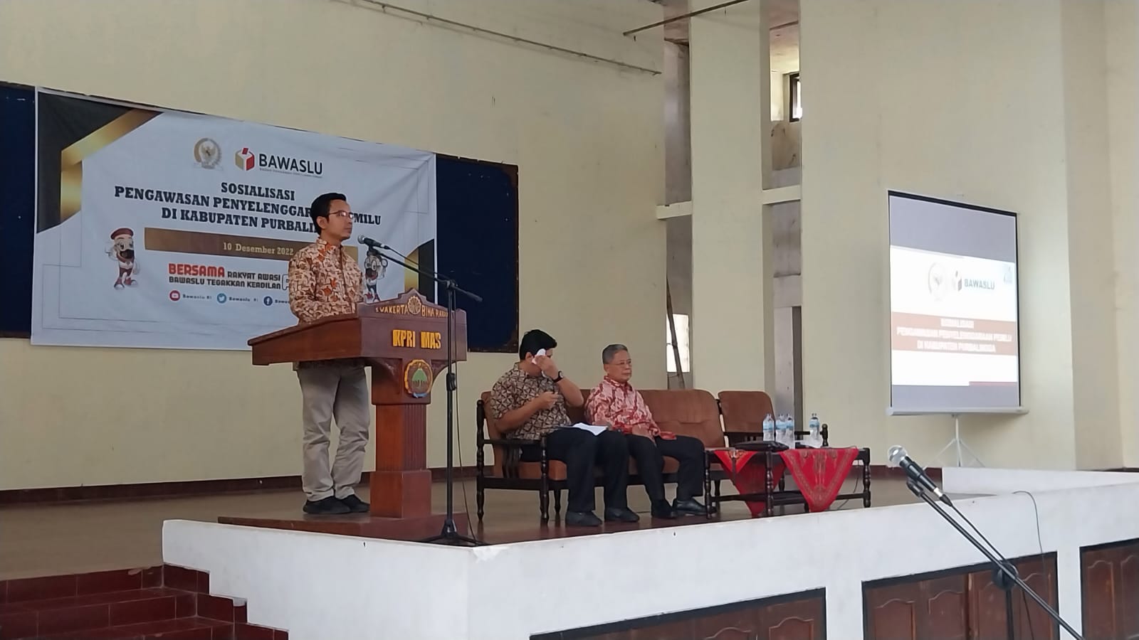 Imam Nurhakim Ketua Bawaslu Kabupaten Purbalingga dalam sambutanya mendorong kepada seluruh peserta sosialisasi untuk turut serta mengawasi jalannya tahapan pemilu yang akan diselenggarakan pada 14 Februari 2024 mendatang.