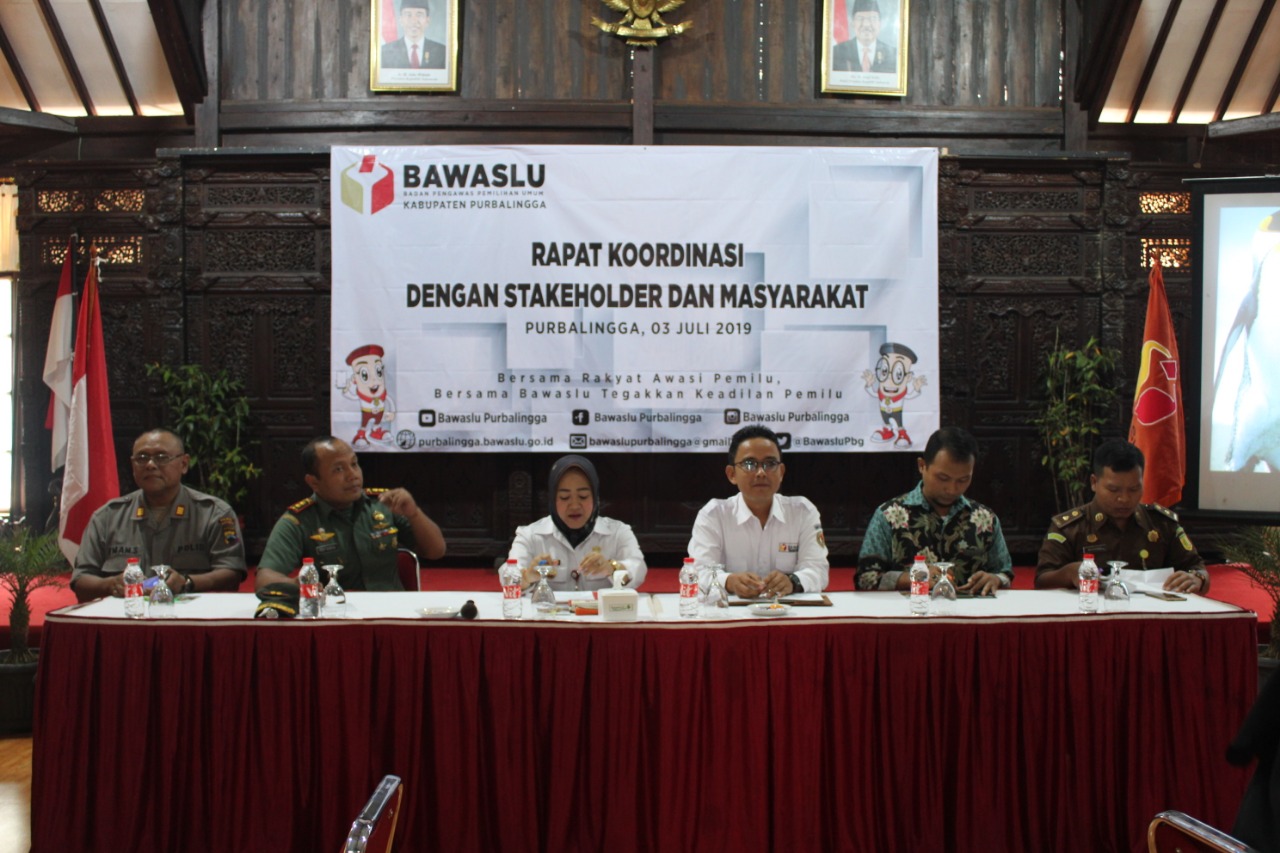 PURBALINGGA - Badan Pengawas Pemilu (Bawaslu) Kabupaten Purbalingga menyelenggarakan kegiatan rapat koordinasi dengan stakeholder dan masyarakat terkait Pemilu 2019, di Aula Hotel Owabong Bojongsari Purbalingga, Rabu (3/7).
