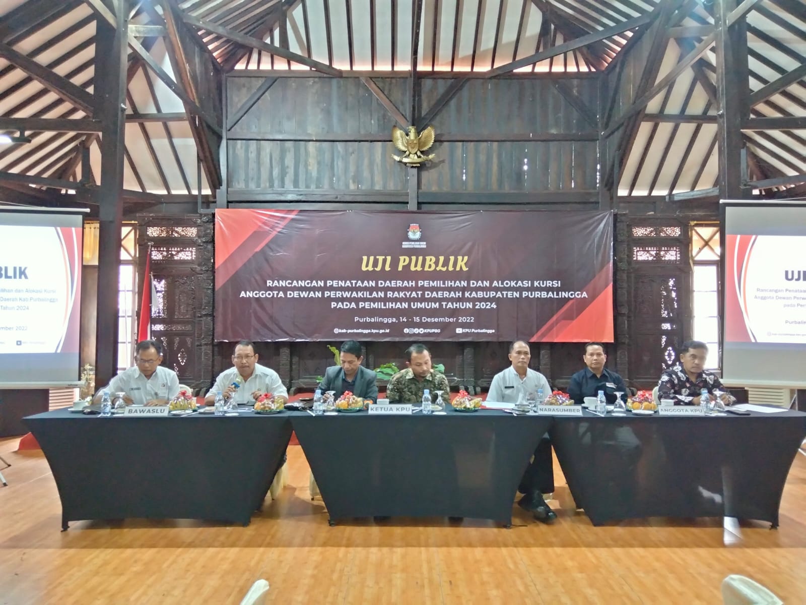 Uji Publik dipimpin langsung oleh Ketua KPU Kabupaten Purbalingga yakni Eko Setiawan, ST. Dalam sambutan sekaligus pembukaan Eko menyampaikan bahwa” ada 3 usulan Dapil yang telah dirancang KPU Kabupaten Purbalingga. Uji Publik ini merupakan momen penting menerima masukan dari masyarakat. Selain hari ini Uji publik juga masih akan berlangsung hingga Kamis, (15/12/2022) untuk menyerap masukan lebih banyak lagi dari elemen masyarakat yang ada di Kabupaten Purbalingga”jelas Eko.