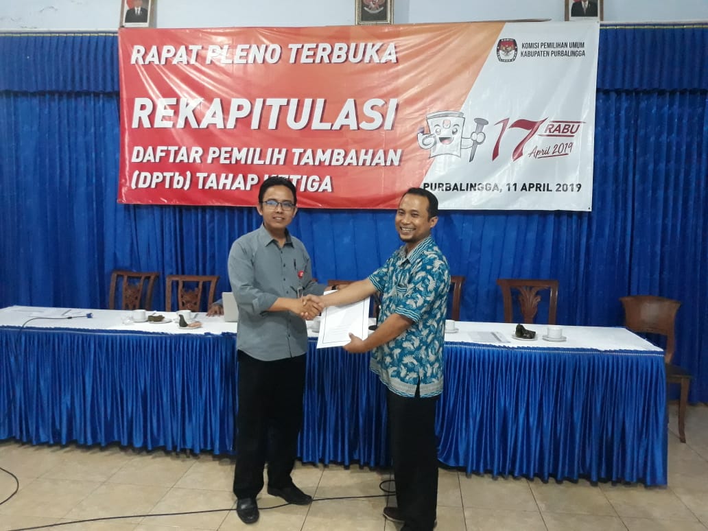 PURBALINGGA - Rapat Pleno Terbuka Rekapitulasi Daftar Pemilih Tambahan (DPTb) Tahap III Pemilu 2019 yang diselenggarakan oleh KPU Kabupaten Purbalingga dilaksanakan pada hari ini Kamis Tanggal 11 April 2019, bertempat di Aula Tien Katering, Jl. Ketuhu, Kelurahan Wirasana, kecamatan Purbalingga yang diikuti oleh 60 Orang.