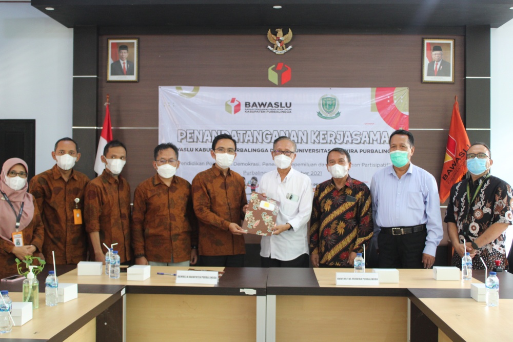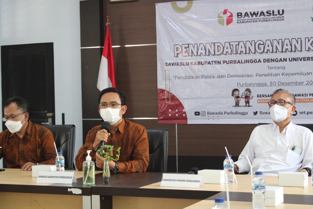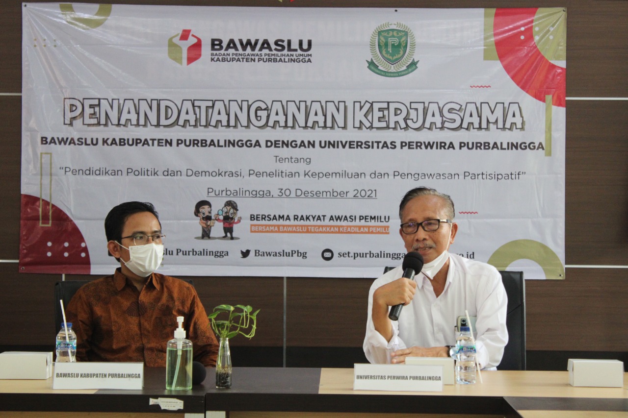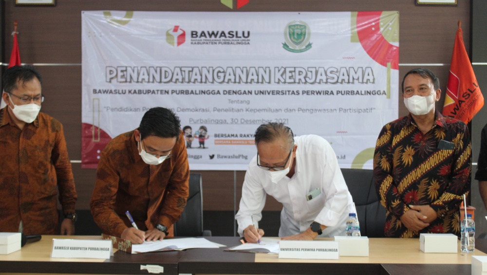 Badan Pengawas Pemilihan Umum (Bawaslu) Kabupaten Purbalingga hari ini Kamis 30 Desember 2021 melaksanakan penandatanganan kerjasama dengan Universitas Perwira Purbalingga (Unperba) tentang pendidikan politik dan demokrasi, penelitian kepemiluan dan pengawasan partisipatif, yang dilaksanakan di Aula Bawaslu Purbalingga.