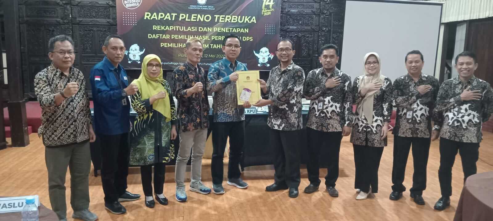 Purbalingga - Dalam pelaksanaan rapat pleno terbuka rekapitulasi dan penetapan Daftar Pemilih Hasil Perbaikan DPS (DPSHP) yang dilaksanakan KPU Kabupaten Purbalingga pada 12 Mei 2023 bertempat di Gedung Andrawina, Owabong Cottage, Kecamatan Bojongsari, Bawaslu Purbalingga hadir dalam formasi lengkap yakni Ketua dan 4 (empat) Anggota.