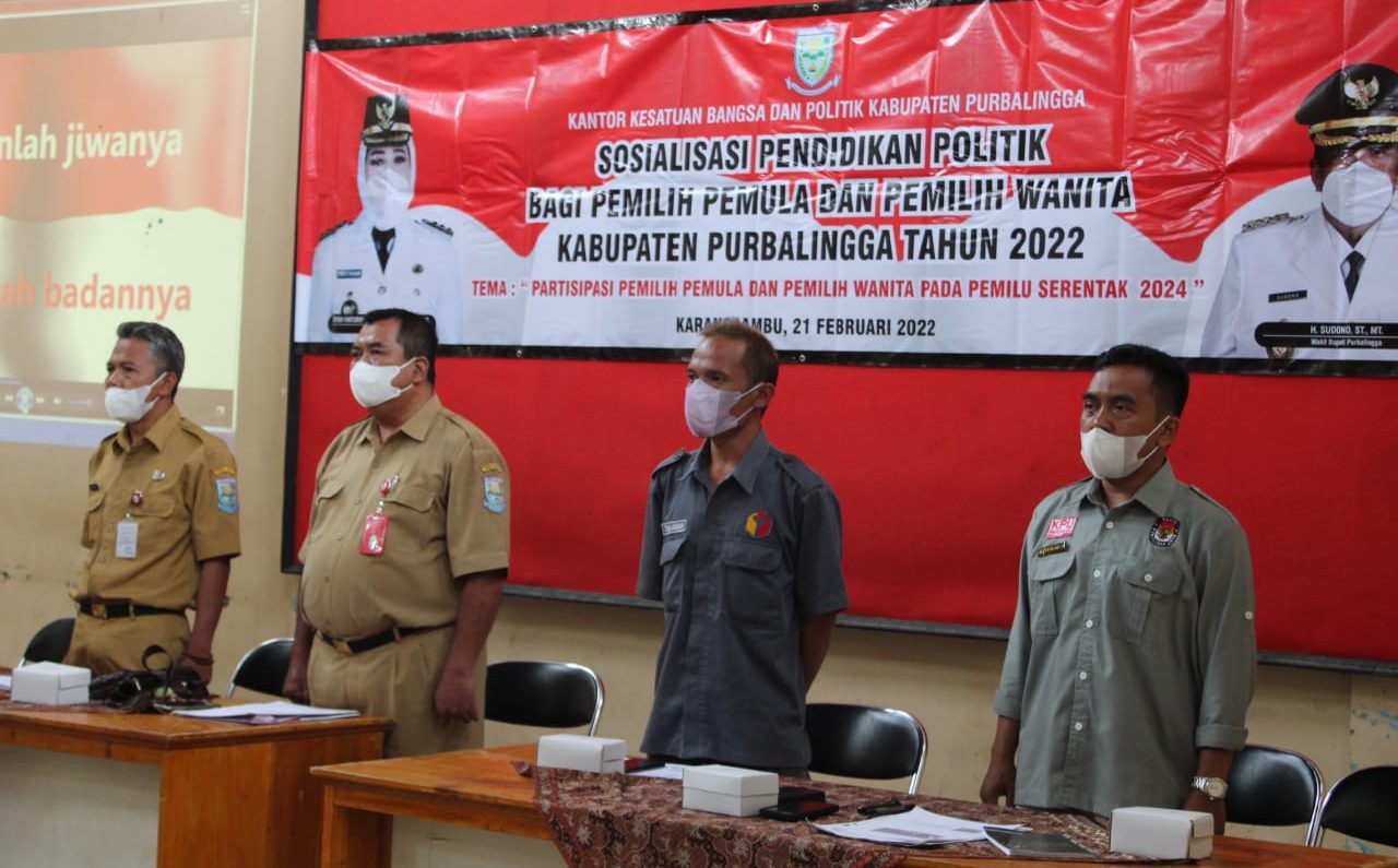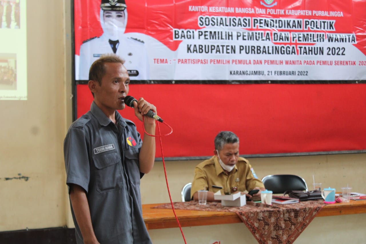 Purbalingga - Anggota Badan Pengawas Pemilu (Bawaslu) Kabupaten Purbalingga, Teguh Irawanto, pada senin (21/2/2022) hadir sebagai narasumber dalam kegiatan Sosialisasi Pendidikan Politik Bagi Pemilih Pemula dan Pemilih Perempuan Kabupaten Purbalingga tahun 2022 yang diselenggarakan oleh Kesabangpol Purbalingga, bertempat di Kecamatan Karangjambu.
