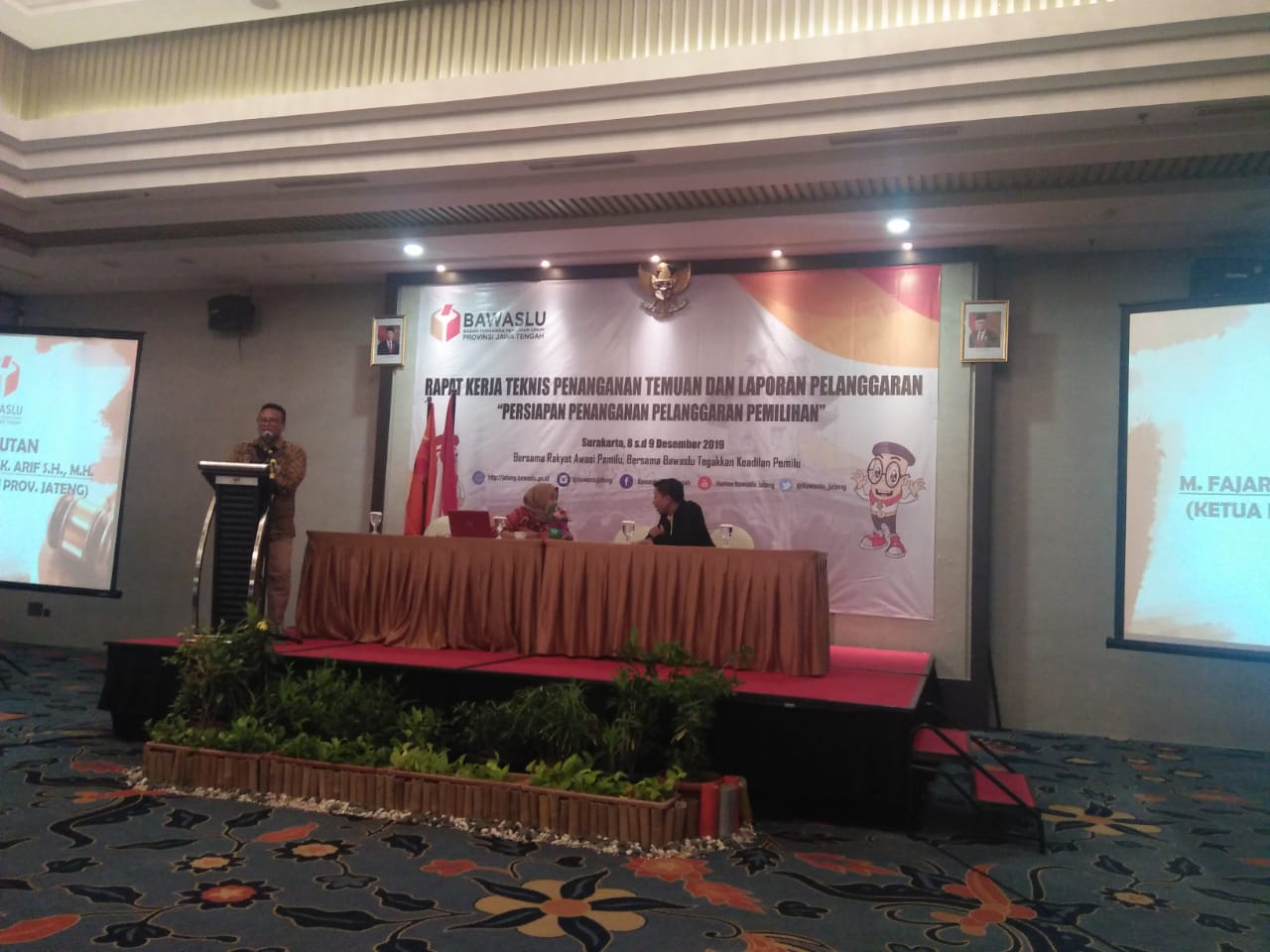 Dalam rangka persiapan menghadapi Pemilihan Kepala Daerah (Pilkada) Tahun 2020, Badan Pengawas Pemilu (Bawaslu) Jawa Tengah menggelar kegiatan rapat kerja teknis penanganan temuan dan laporan pelanggaran "persiapan penanganan pelanggaran Pemilihan", berlangsung di Swiss Belinn hotel Solo Jawa Tengah, 8 sampai dengan 9 Desember 2019.