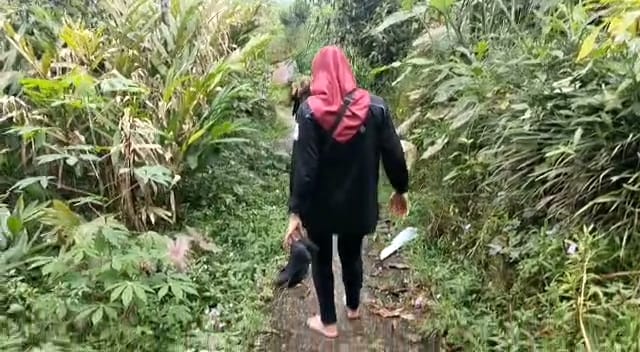 Keterangan: Yunita Barokah (Anggota Panwaslu Kecamatan Karangreja) harus melepas alas kaki demi bisa melalui jalan licin menuju rumah anggota partai tersampling