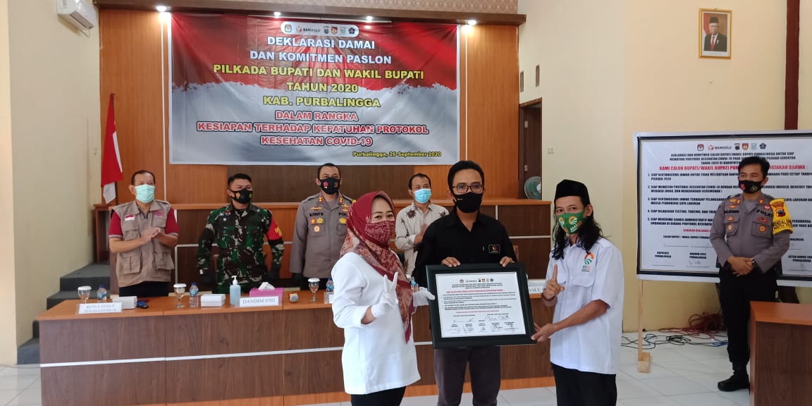 Acara yang diselenggarakan di Aula Komisi Pemilihan Umum (KPU) Purbalingga tersebut, pasangan Muhamad Sulhan Fauzi-Zaini Makarim (Oji-Jeni) diwakili Sukhedi dan Budi Nur Zaenanto (selaku anggota tim kampanye) dan Dyah Hayuning Pratiwi-Sudono (Tiwi-Sudono) menandatangani Deklarasi Damai dan Komitmen Kepatuhan Terhadap Protokol Kesehatan Covid-19 selama masa Pilkada serentak tahun 2020.