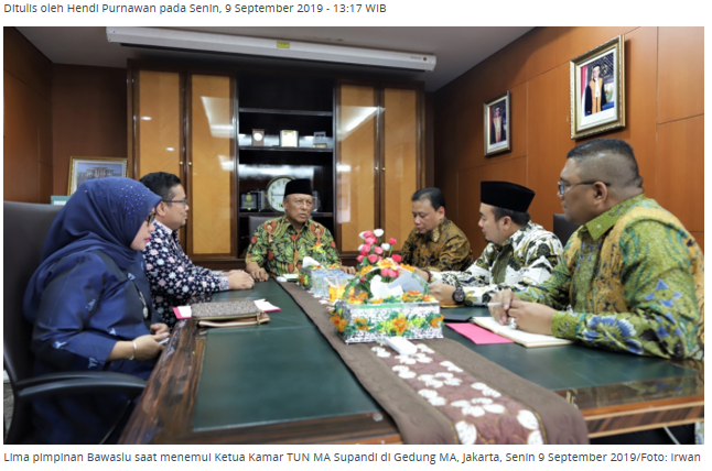 Senin (9/9/2019), Ketua Bawaslu Abhan beserta empat pimpinan lainnya, yaitu: Ratna Dewi Pettalolo, Mochamad Afifudin, Rahmat Bagja, dan Fritz Edward Siregar melakukan audiensi dengan MA. Rombongan diterima Ketua Kamar Tata Usaha Negara (TUN) MA, Supandi dan Panitera Muda TUN MA, Ashadi.