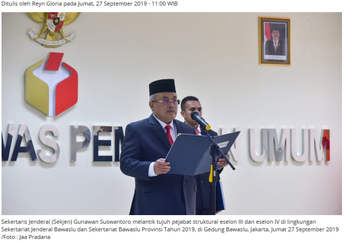 Jakarta Badan Pengawas Pemilihan Umum - Sekertaris Jenderal (Sekjen) Bawaslu Gunawan Suswantoro melantik tujuh pejabat struktural eselon III dan eselon IV di lingkungan Sekertariat Jenderal Bawaslu dan Sekertariat Bawaslu Provinsi Tahun 2019. Pelantikan ini dilakukan guna mempersiapkan pejabat-pejabat yang siap menyempurnakan kinerja Bawaslu pada Pilkada serentak 2020.