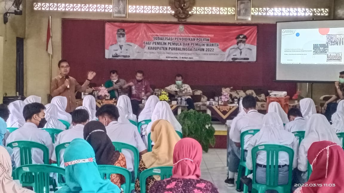 PURBALINGGA_Ketua Badan Pengawas Pemilihan Umum (Bawaslu) Kabupaten Purbalingga Imam Nurhakim pada Selasa (15/03/2022) hadir sebagai Narasumber dalam kegiatan Sosialiasasi Pendidikan Politik bagi Pemilih Pemula dan Pemilih Perempuan Kabupaten Purbalingga tahun 2022.