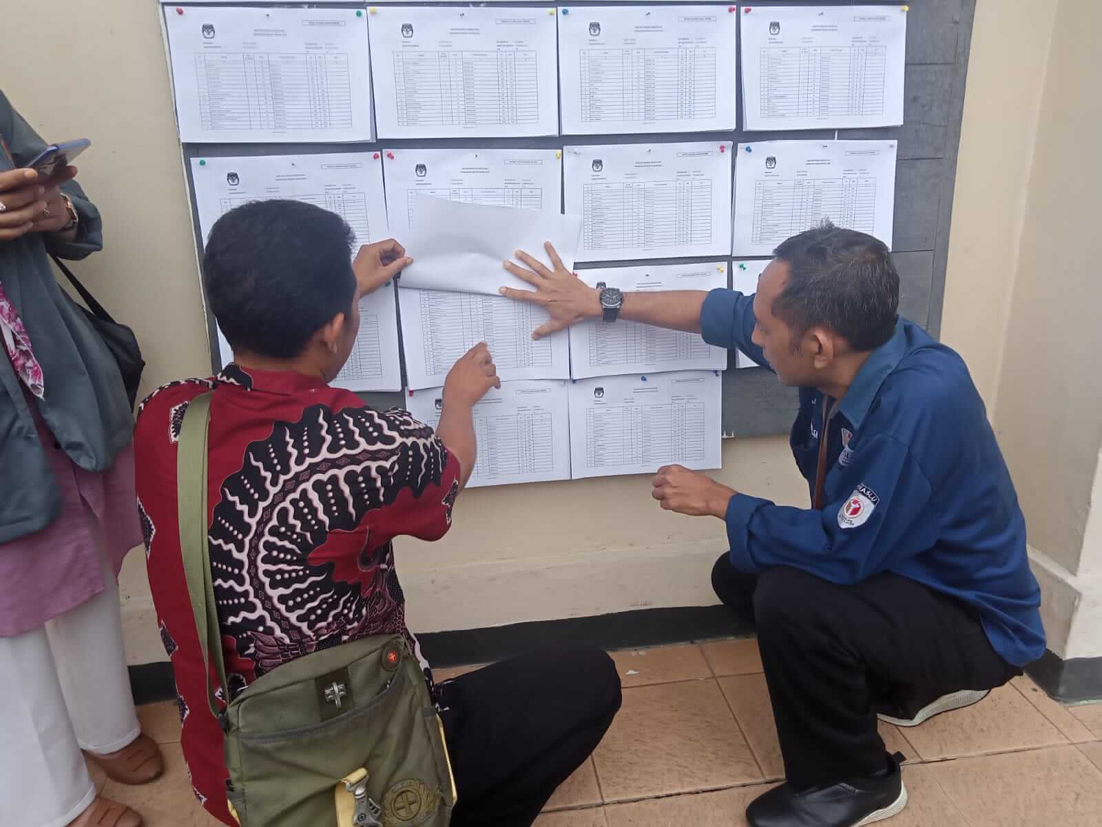 Keterangan: Setiawati (tengah, berkerudung hitam) memastikan pengumaman DPS telah dipasang di Desa Tumanggal, Kec. Pengadegan