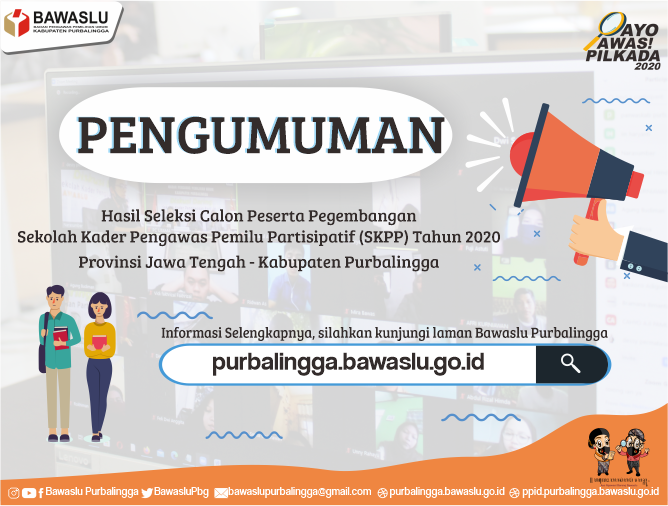 Berdasarkan Berita Acara Rapat Pleno Bawaslu Kabupaten Purbalingga Nomor: 079/BawasluProv.JT-20/HK.01.01/X/2020 tentang Penetapan Hasil Seleksi Calon Peserta Pegembangan Sekolah Kader Pengawas Pemilu Partisipatif (SKPP) Tahun 2020, bersama ini diumumkan nama Peserta yang dinyatakan LULUS sebagai berikut :