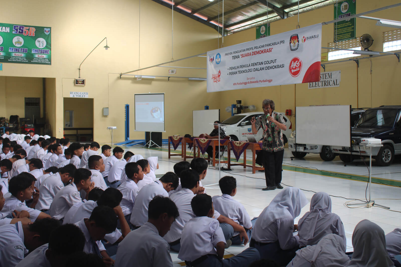 Purbalingga-Selasa(26/09/2023) Bawaslu Kabupaten Purbalingga berkesempatan mengisi program P5 di SMK YPT 2 Purbalingga dengan tema "Pemilih Pemula, Golput, Teknologi dan Demokrasi, Pengawasan Partisipatif Mengawal Demokrasi", yang disampaikan langsung oleh Heru Tri Cahyono S.Sos Anggota Bawaslu Kabupaten Purbalingga.
