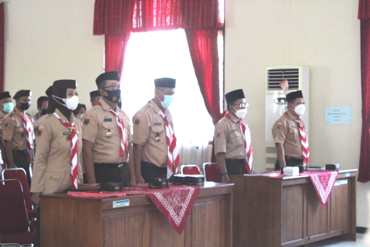 Keterangan Gambar : Misrad, S.E. selaku Pin SAKA Bawaslu Purbalingga ( dua dari kanan gambar) sedang mengikuti prosesi acara Musyawarah Cabang (Muscab) Gerakan Pramuka Kwartir Cabang Kabupaten Purbalingga tahun 2021.