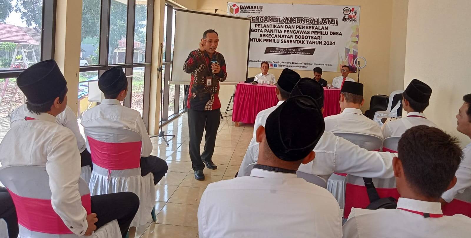 Purbalingga, Minggu (05/02/2023) Ketua Panwaslu Kecamatan Bobotsari Joko Yuno Trianto, S.E. secara resmi melantik 16 jajaran Panwaslu Kelurahan/Desa (15 Laki-laki dan 1 Perempuan) terpilih untuk mengawasi tahapan pemilu tahun 2024 ditingkat desa, bertempat di gedung BUMDes Loskar Mulia desa Karangduren kecamatan Bobotsari, dari pukul 08.00-14.30 WIB.