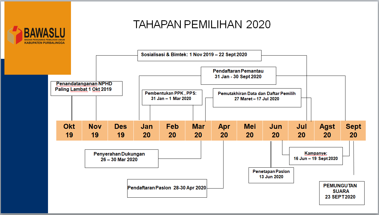 Misrad, Kordiv Pengawasan Humas dan Hubal Bawaslu Purbalingga mengatakan “tahapan sudah dimulai sejak bulan Oktober 2019 ini yang mana tertuang dalam Peraturan Komisi Pemilihan Umum Nomor 15 tahun 2019 maka penting masyarakat untuk mengetahui regulasi ini” jelasnya.