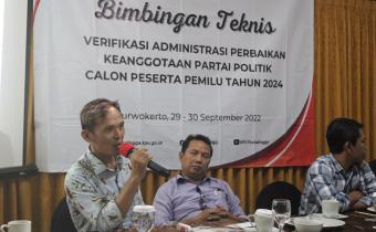 Banyumas - Bawaslu Kabupaten Purbalingga pada Jumat (30/09/2022) yang diwakili oleh Teguh Irawanto menghadiri secara langsung sebagai narasumber pada kegiatan Bimbingan Teknis Internal untuk Verifikator dalam Rangka Verifikasi Administrasi Perbaikan yang dilaksanakan oleh KPU Kabupaten Purbalingg