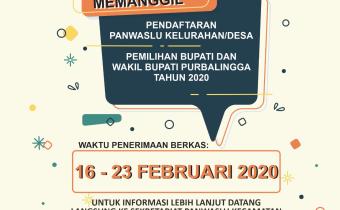 Dalam rangka pembentukan Panwaslu kelurahan/Desa dalam Pemilihan Bupati, dan Wakil Bupati Purbalingga tahun 2020, Panwaslu Kecamatan Se kabupaten Purbalingga, berdasarkan Peraturan Badan Pengawas Pemilihan Republik Indonesia Nomor 19 Tahun 2017 Sebagaimana diubah terakhir dengan Peraturan Badan P