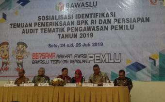 PURBALINGGA - Badan Pengawas Pemilu (Bawaslu) RI, sejak kemarin Rabu 24 Juli 2019 hingga 26 Juli 2019 menggelar acara sosialisasi identifikasi temuan pemeriksaan BPK RI dan persiapan audit tematik pengawasan Pemilu 2019 di hotel Paragon Solo Jawa Tengah.